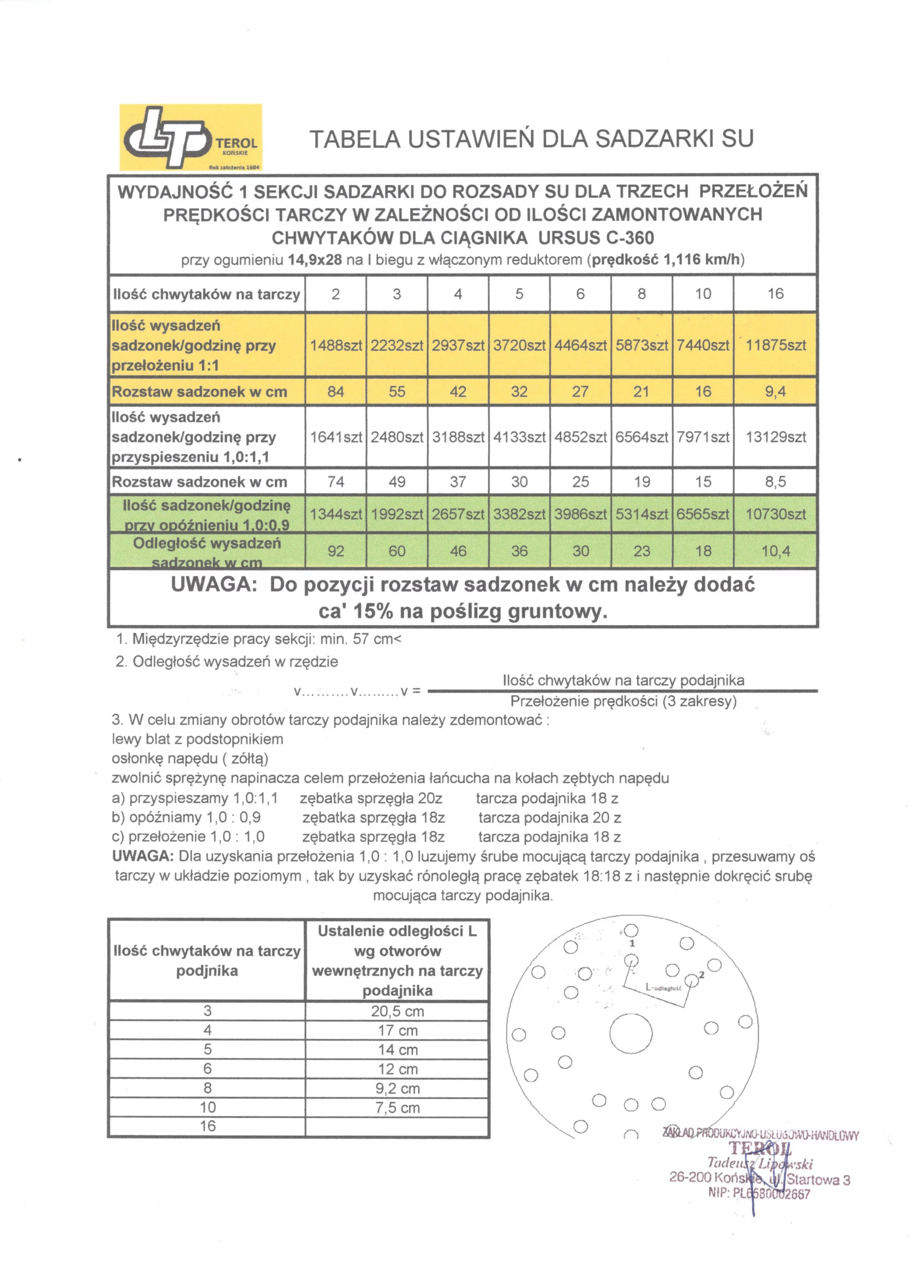 Tabela przedstawiająca ustawienie rozstawu wysadzeń względem ilości chwytaków oraz w zależności od ustawionej ww. przekładni widoczna na ostatnim zdjęciu.